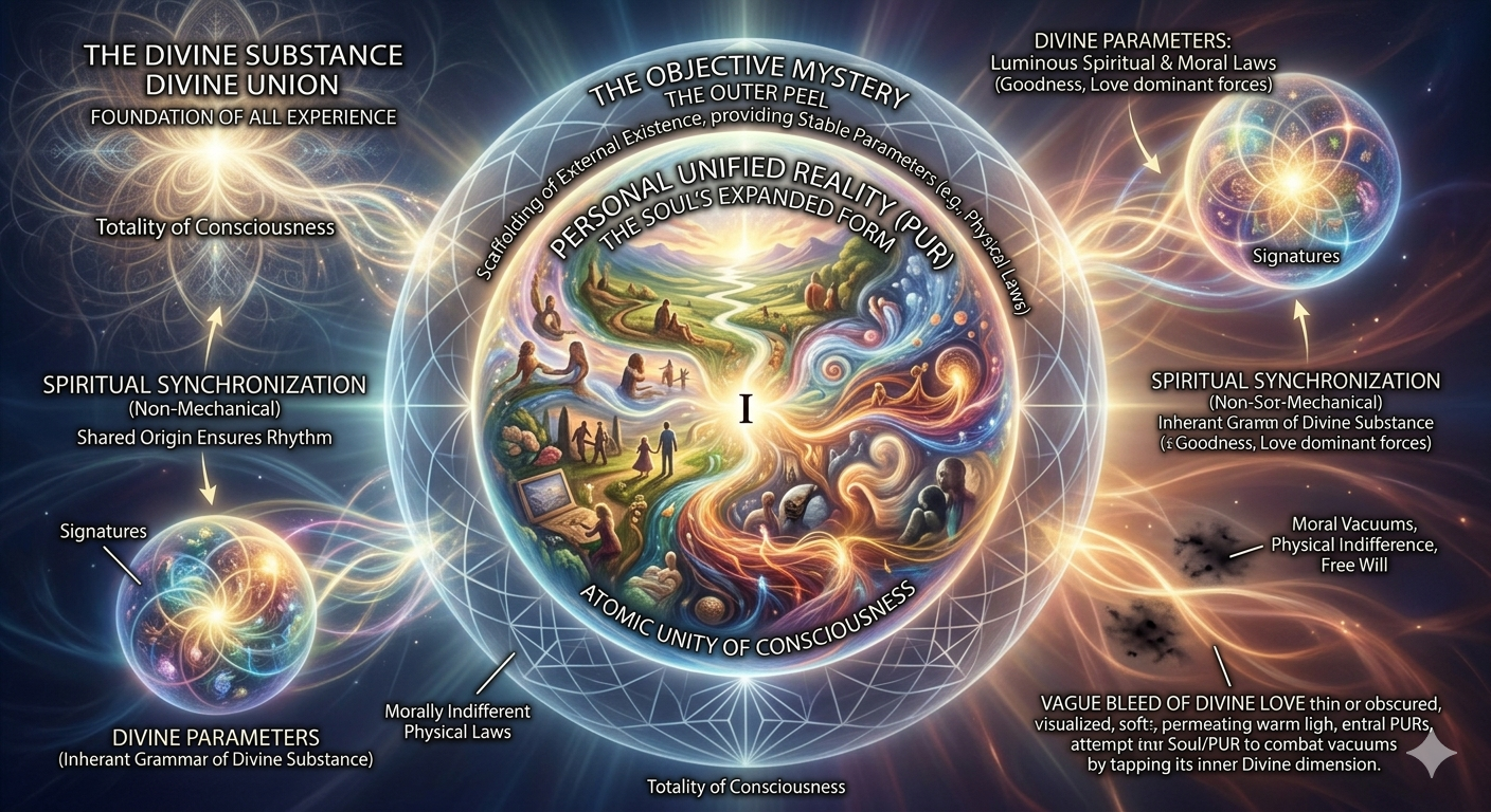 In the framework of PURT, mystical experiences are defined as profound moments where the threshold of day-to-day awareness becomes porous, allowing the Soul to dip into its own hidden dimension. During these events, the individual temporarily moves beyond the filtered interpretations of the Personal Unified Reality to experience the Divine realm and its spiritual parameters in an unfiltered state. Such experiences are not mere hallucinations but are regarded as high-definition perceptions where the Soul sees the luminous mystery “with its own spiritual eyes.” By bypassing the outer physical “peel” of the Objective Mystery, the mystic gains direct access to inner spiritual “fruit”—the absolute love and omni-aware unity that characterize the Divine substance. These glimpses offer a preview of the Soul’s ultimate nature and serve to validate the intuitive knowledge that all Souls carry subliminally throughout their physical lives. Consequently, the mystic returns to the everyday world with a transformed understanding of the “vague bleed” of Divine Love, having witnessed the radiant source from which all goodness and beauty originate.